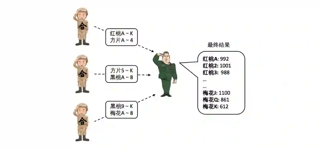 然后所有的“合计算兵”把自己的计算结果上交给“指挥官”,“指挥官”汇总后公布最终统计的结果。