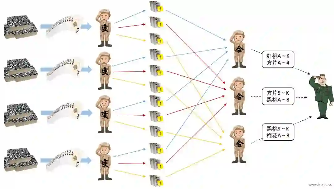 洗牌分两个阶段,第一阶段是每个“变计算兵”将变种扑克牌按照一定的规则分类,分类的规则取决于每个“合计算兵”的统计范围,分类的个数取决于“合计算兵”的个数。如上图所示,假设有3个“合计算兵”分别负责不同范围的牌型的统计,那么“变计算兵”需要根据每个“合计算兵”负责的牌型将自己的变种扑克牌分成3个小份,每份交给对应的“合计算兵”。
