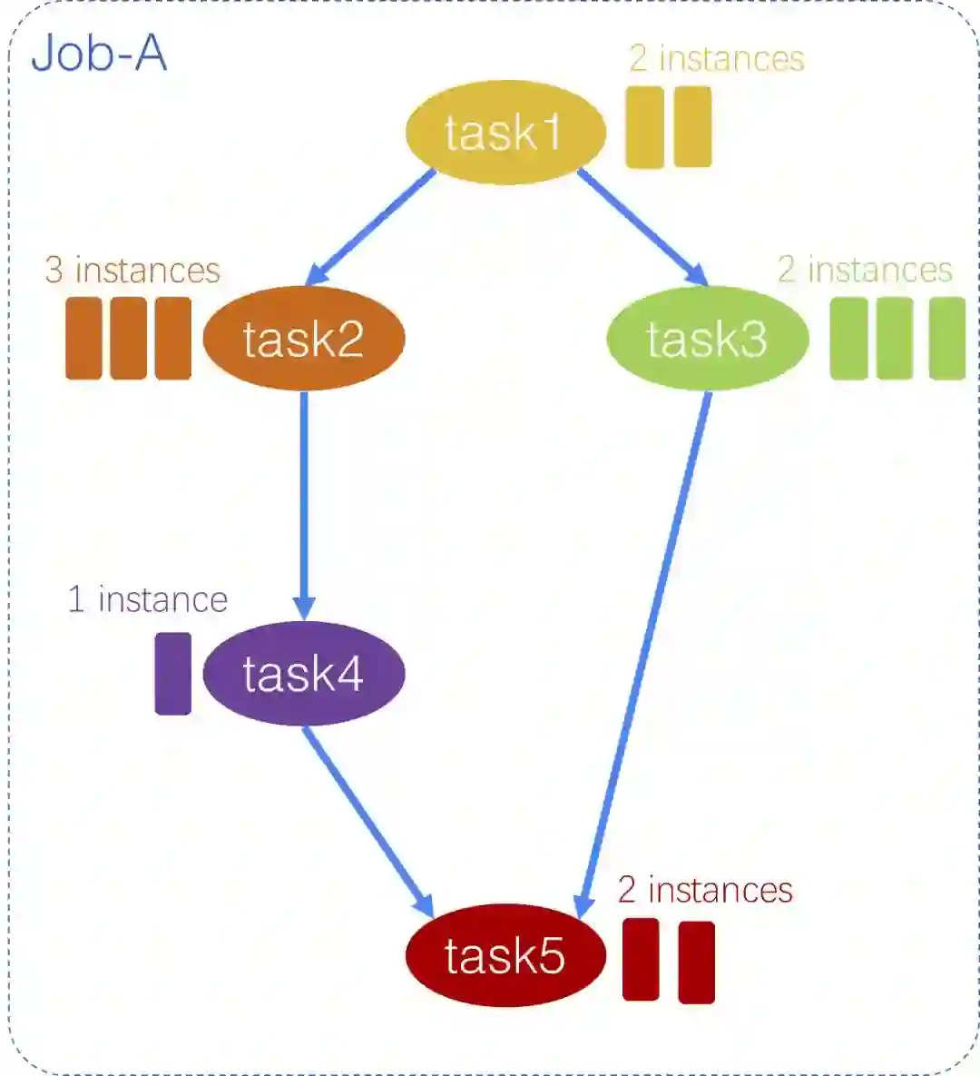 究竟什么是 DAG?离线计算任务,例如 Map Reduce、Hadoop、Spark、Flink 中常用的任务,都是以有向无环图(Directed Acyclic Graph,DAG)的形式进行编排的,其中涉及到任务之间的并行、依赖等方面。下面是一个 DAG 的例子。