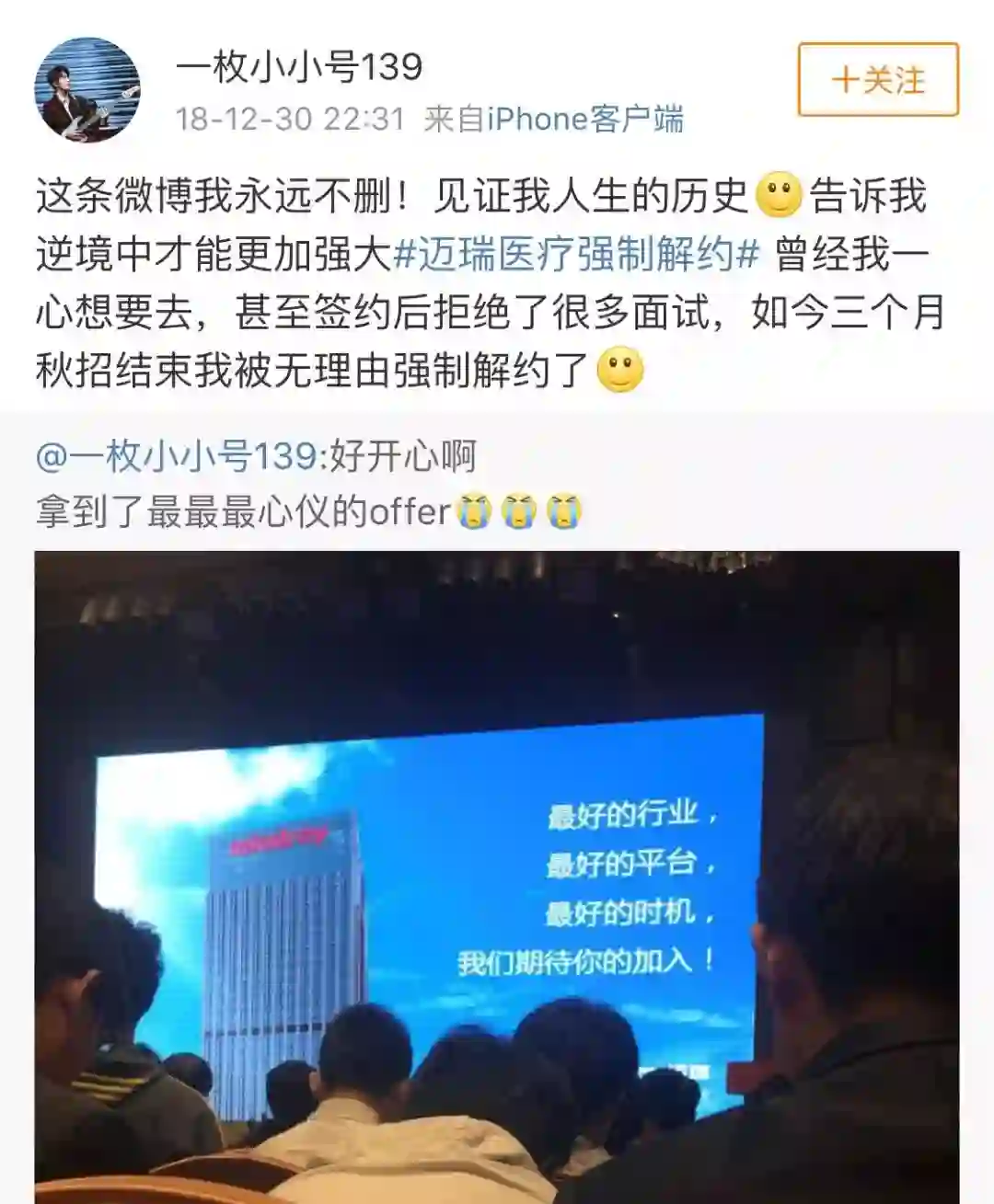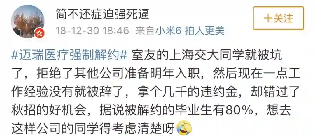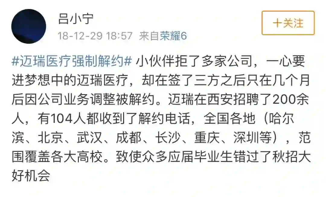 有个小伙伴前段时间在微博发文庆祝自己拿到迈瑞医疗的offer,结果在2019年来临的时候,遭到解约。