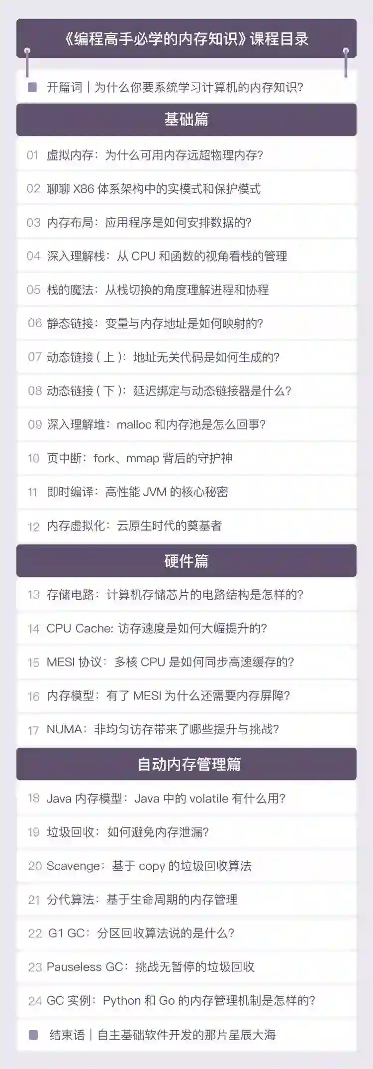 在这个专栏里,海纳秉承着“垂直化学习”的理念,避免了水平式讲解难以形成体系的问题,带你将内存知识的繁多、复杂等难点问题层层突破。课程主要分为三个部分:软件篇,硬件篇和自动内存管理篇。