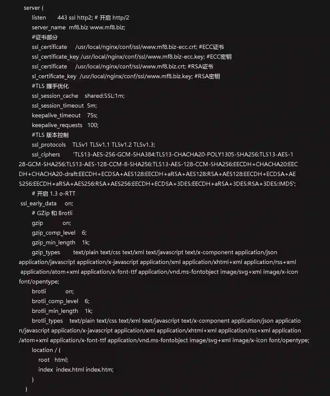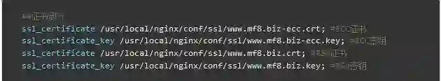 双证书配置的很简单了,保证域名的证书有RSA和ECC各一份即可。