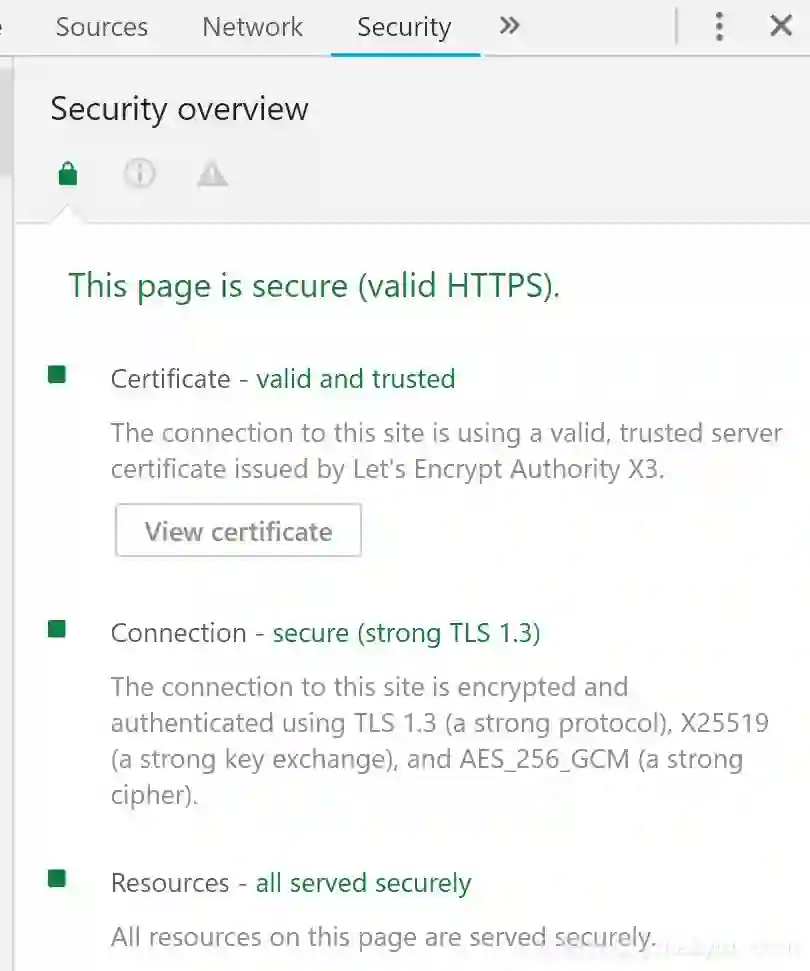 老地方,我们可以通过浏览器的开发者工具 中的 Security 栏目看到 Connection 栏目下是否有显示 TLS 1.3