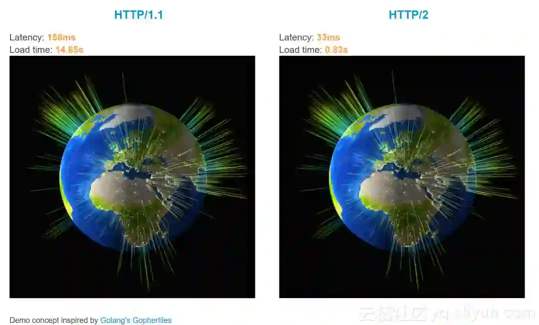 在 Akamai 的 HTTP/2 DEMO中,加载300张图片,HTTP/2 的优越性极大的显现了出来,在 HTTP/1.X 需要 14.8s 的操作中,HTTP/2 仅需不到1s。