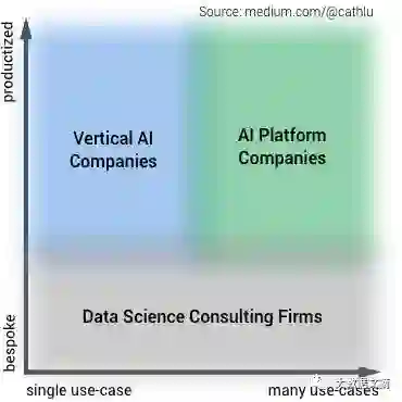 在他们中,我们能够看到为客户提供定制解决方案的“数据科学咨询公司”,为AI解决方案提供底层基础构架的“AI平台公司”,以及通过产品化解决方案解决某个特定商业问题的“垂直整合AI公司”。
