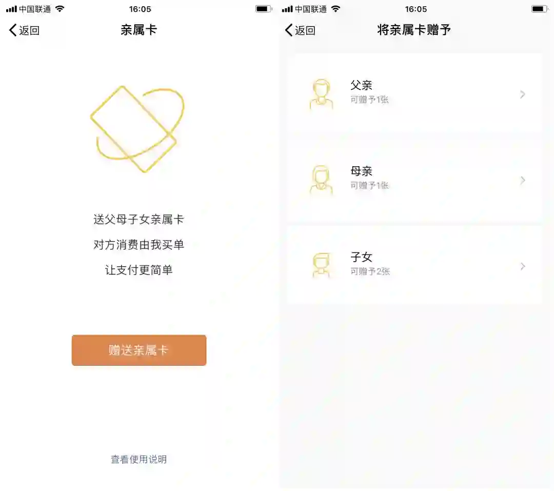 进入到【亲属卡】页面后,页面会让你选择【赠送亲属卡】,点击一下,接下来就会选择赠送父亲一张、母亲一张、子女2张,从中选择一个。