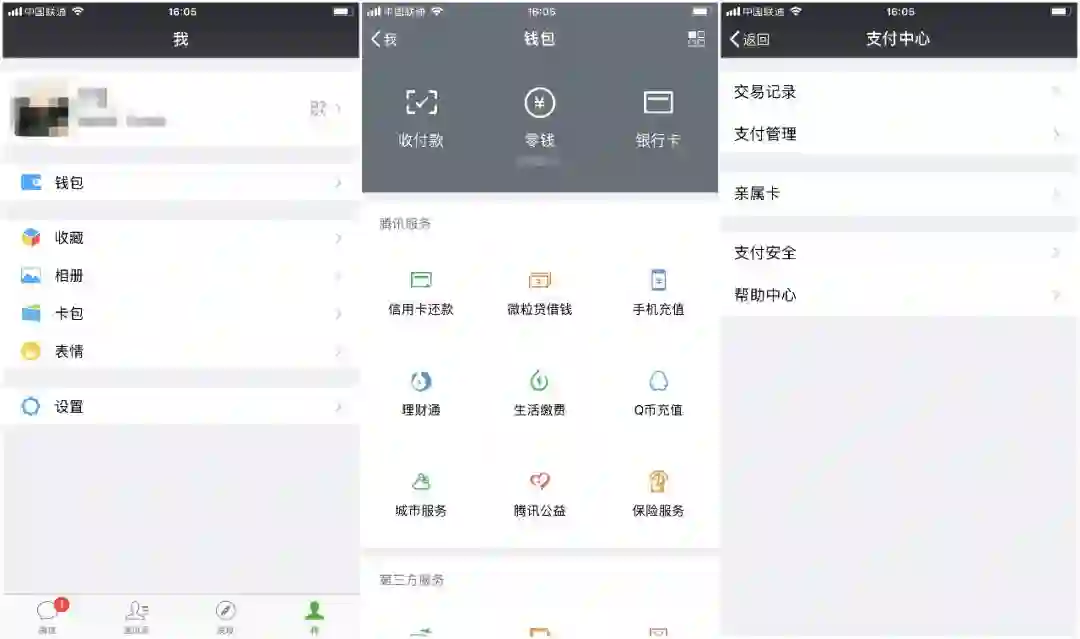 不过,这个功能隐藏得有点深,需要进入【我】的个人中心,打开【钱包】选项,点击【支付中心】后才能看到【亲属卡】入口。