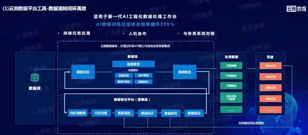 云测数据新一代解决方案中基于这些需求打造了数据处理工作台,支持持续任务处理、人机协作,同时以标准API接口与各类系统对接,将AI数据训练过程中的综合效率提升200%。