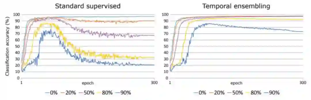 VAT 与 Temporal ensembling Model 的不同之处在于,后者采用数据增强、dropout 来对无标签数据施加噪声,而前者施加的则是模型变化最陡峭方向上的噪声,即所谓的对抗噪声。在作者看来,如果模型在对抗噪声下,依然能够保持光滑,那么整个网络就能够表现出很好的一致性。
