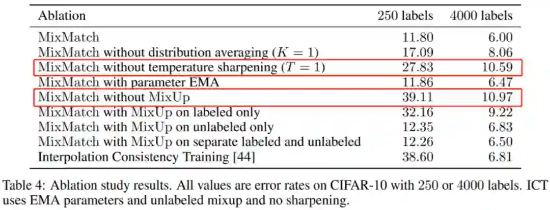 此外,研究人员运用控制变量法对于 MixMatch 中用到的各类技术进行单独研究,结果如下图所示: