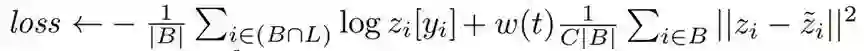 其中,第一项为交叉熵,用于计算有标签数据的误差;第二项为 MSE,用来计算无标签数据与伪标签之间的均方误差,对应前面提到的 Consistency Regulation。