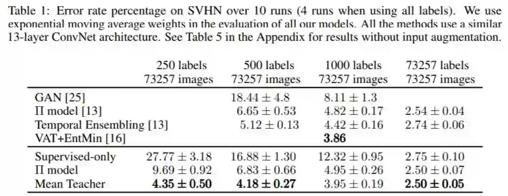 与其他技术方案相比,在某些情况下,Mean Teacher 技术没有 VAT 的方案表现优秀。对于这一点,论文作者也提到,由于两个方案切入维度不同,因而二者完全可以互补,从而带来更大的模型提升。