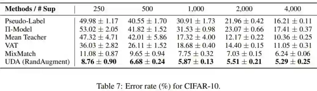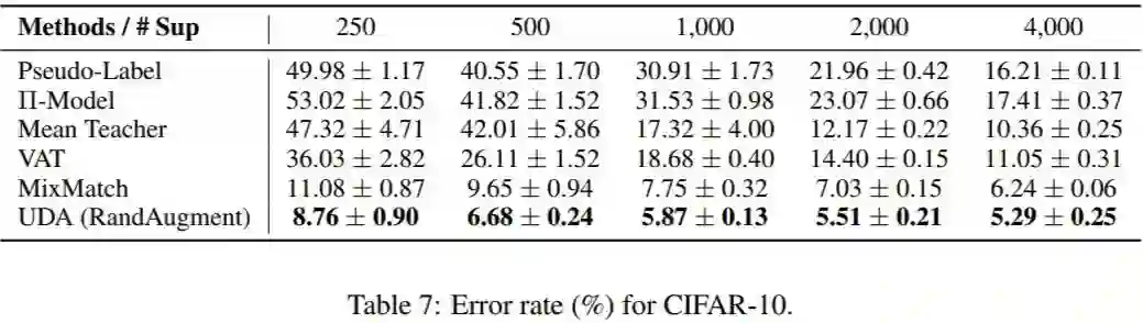 由此可知,UDA 与前面提到几个半监督模型相比,本身在半监督学习框架上并没有太大的创新,其贡献更多的是将近年来深度学习领域其他的新技术和新思想结合进半监督学习中。