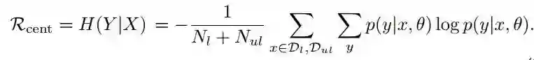其中,左边第一项为交叉熵,用来评估有标签数据的误差。右边第二项即为 entropy regularization 项,用来从无标签的数据中获取训练信号。