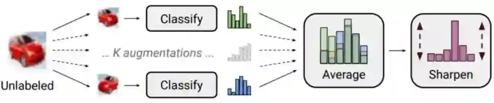 MixMatch 可以认为是近几年半监督学习技术的集大成者,融入了前面提到 Consistency Regulation、伪标签思想、entropy regularization 以及 MixUp 技术,最终实现了显著优于之前半监督学习技术的效果。