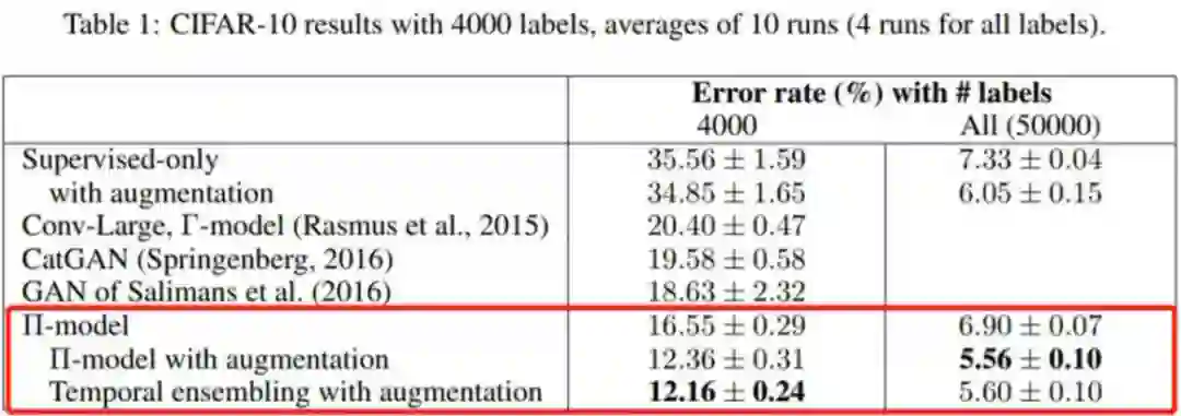 即使在完整数据集下,此论文所提出的方法也比纯监督的方法更优,额外提升 0.5 个百分点。这说明本文所采用的一致性正则项完全可以充当通用的正则项,用来约束模型对于输入的局部噪声不敏感。