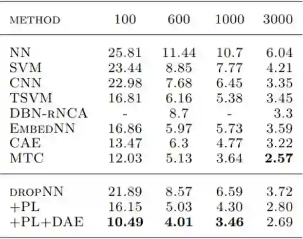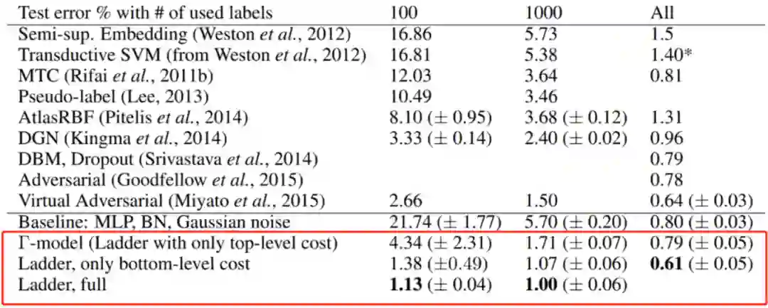 其中也包括 2.1 中提到的 Pseudo-Label 模型。尤其值得一提的是,Ladder 仅仅采用了不到 1% 的有标签数据就实现了 1% 的错误率,与完整数据集相比,仅低了 0.5%。