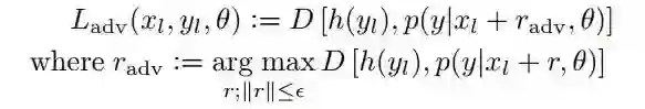 在此思路下,VAT 的目标函数与 Temporal ensembling Model 类似,包含有标签数据部分的交叉熵,以及无标签数据部分的一致性正则项。此处一致性正则项的数学形式如下: