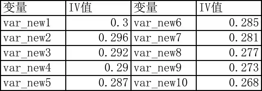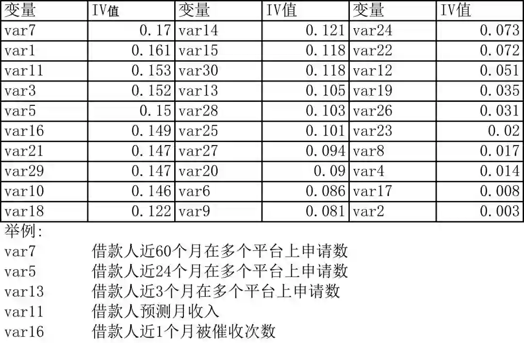 30个原始变量的IV值倒序结果如表1展示(变量本身进行了脱敏),我们发现,预测能力最强的变量具有IV值0.170(var7,即变量7)。