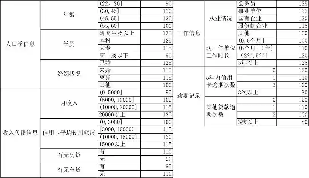 三,信用评估。在传统的信用评估领域,评分卡(score card)是一个被广泛使用的技术和方法。评分卡根据用户的申请资料对用户进行打分,根据用户最终的得分决定是否给用户授信。以下是一张典型的评分卡示例: