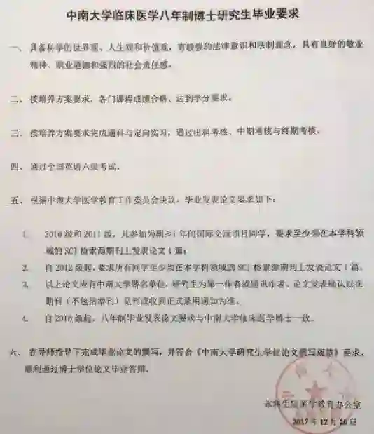 简单来讲就是2017年,中南大学湘雅医学院临时出通知,要求 2010 级,2011 级赴外交流学生及 2012 级全体学生发表一作 SCI 论文后才能毕业,但这让 10、11、12 级的学生陷入一个尴尬的处境。