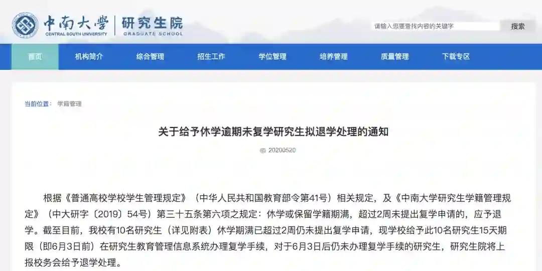 5月20日,中南大学表示,截至目前,共有10名研究生休学期满已超过2周仍未提出复学申请。对于6月3日后仍未办理复学手续的研究生,研究生院将上报校务会给予退学处理。
