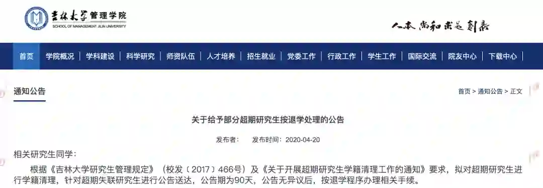 据吉林日报消息,目前,吉林大学有超20个学院发布公告,超期研究生超过100人。但对于正在积极准备论文答辩的超期研究生,可以给予答辩机会,最后答辩截止时间为2020年12月31日,超期不能答辩的研究生将按退学处理。