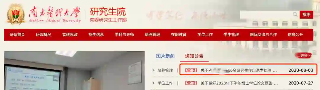 8月3日,南方医科大学研究生院官网置顶了一则通告。根据有关规定,该校拟对16名研究生作退学处理。其原因为黄某某等16名研究生在规定学年未能完成学业。