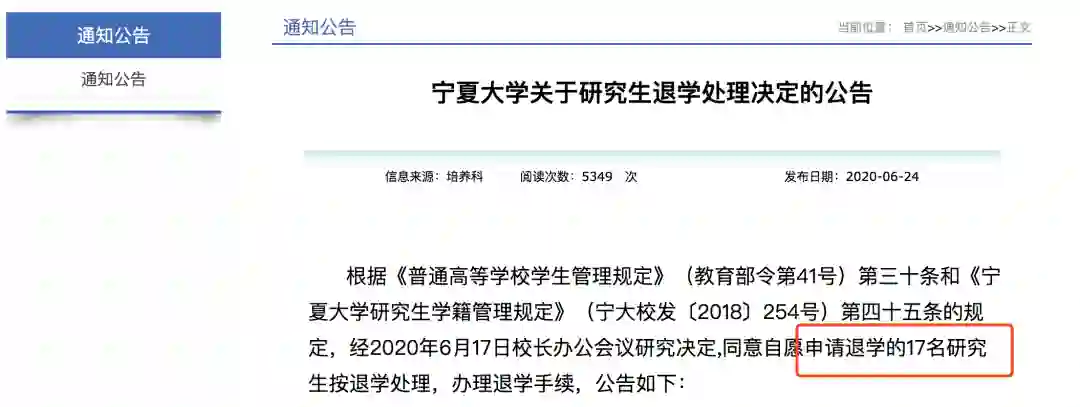 6月24日,宁夏大学发布通知,同意自愿申请退学的17名研究生按退学处理。