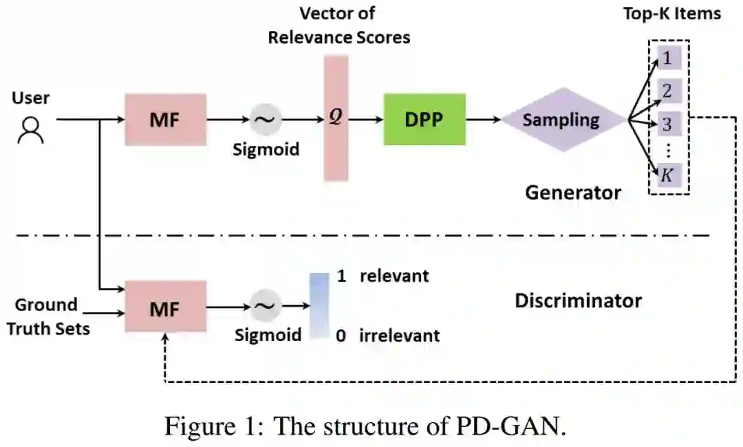PD-GAN: Adversarial Learning for Personalized Diversity-Promoting Recommendation 本文提出了一种新的推荐模型-个性化多样性提升GAN(Personalized Diversity-promoting GAN,PD-GAN)。具体而言,对于每个用户,生成器通过从个性化的确定点过程(personalized Determinantal Point Process,DPP)核矩阵中进行序列抽样来推荐一组不同的相关项。该核矩阵由两个可学习的组件构成:多个项目的一般共现性和用户对项的个人偏好。为了学习第一部分,我们提出了一种新的使用训练对的成对学习范式,每个训练对由一组不同的项目和一组随机抽取的所有用户的观察数据组成。第二部分是通过针对判别器的对抗性训练来学习的,该判别器致力于从目标用户的观察数据中随机抽取推荐项目和ground truth之间的区别。实验结果表明,PD-GAN能更好地生成既多样又相关的推荐方案。 论文地址: https://www.ijcai.org/proceedings/2019/0537.pdf