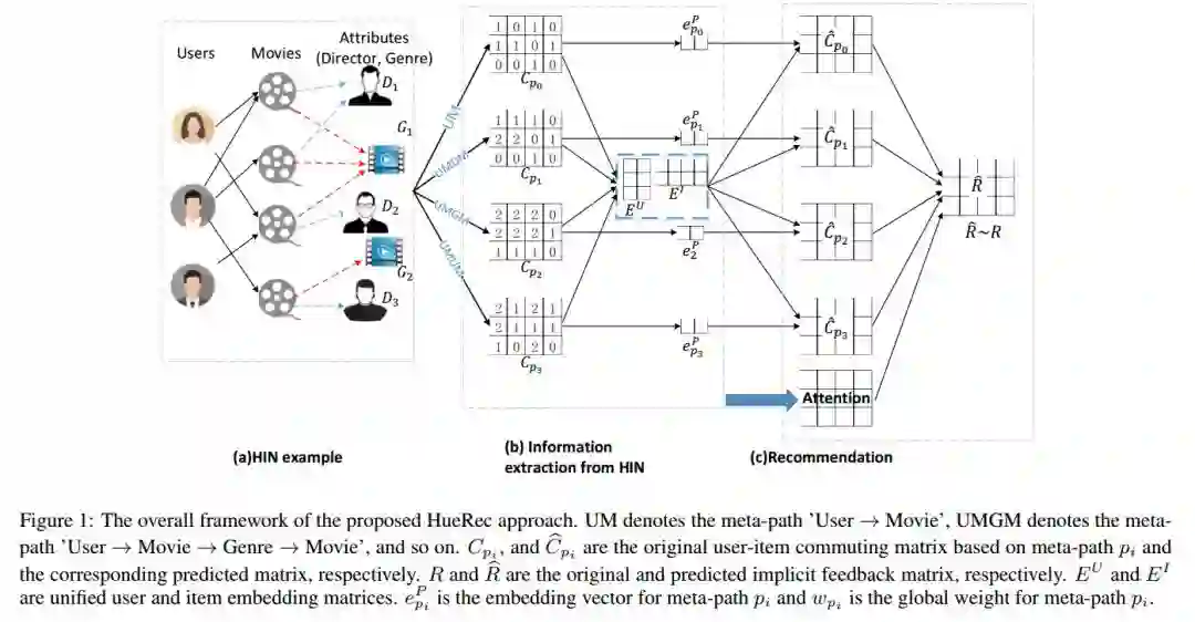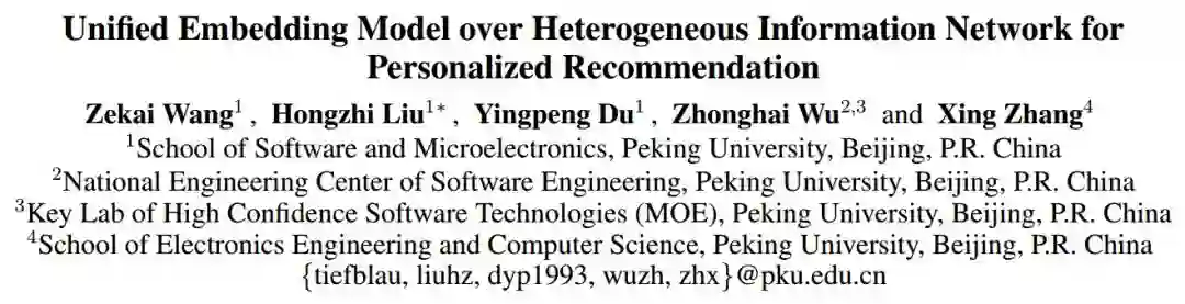 Unified Embedding Model over Heterogeneous Information Network for Personalized Recommendation 大多数异构信息网络(HIN)的推荐模型基于具有元路径的用户和项目建模。然而,它们总是模型用户和在每个元路径下隔离的项目,这可能导致信息提取产生误导。此外,他们只考虑HINs在探索HINs过程中建模用户和项目时的结构特征,这可能会导致有用信息不可逆地丢失。为了解决这些问题,我们提出了一个基于HIN的统一嵌入模型,称为HueRec。我们假设在每个用户或项目的不同元路径下存在一些共同特征,并且使用来自所有元路径的数据来学习统一用户和项目表示。因此,利用元路径之间的相互关系来缓解单通道上的数据稀疏和噪声问题。与先探索HINs然后推荐的现有模型不同,我们将这两个部分合并成一个端到端的模型,以避免在初始阶段丢失有用的信息。此外,我们还将所有用户、项和元路径嵌入到相关的潜在空间中,因此我们可以测量用户对元路径的偏好,从而提高个性化推荐的性能。广泛的实验表明,hueRec的性能优于最先进的方法。 论文地址:https://www.ijcai.org/proceedings/2019/0529.pdf