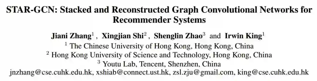 STAR-GCN: Stacked and Reconstructed Graph Convolutional Networks for Recommender Systems 为了提高推荐系统的性能,特别是在冷启动场景中,我们提出了一种新的叠加重构图卷积网络(STAcked and Reconstructed Graph Convolutional Networks, STAR-GCN)体系结构。STAR-GCN采用了一堆GCN编解码器与中间监督相结合,以提高最终的预测性能。与one-hot编码节点输入的图卷积矩阵完成模型不同,我们的STAR-GCN学习低维用户和项的潜在因素作为输入,以抑制模型空间复杂度。此外,我们的STAR-GCN可以通过重构隐藏的输入节点嵌入来生成新节点的节点嵌入,这实质上解决了冷启动问题。此外,在对基于GCN的链路预测任务模型进行训练时,我们发现了一个标签泄漏问题(label leakage issue),并提出了一种避免该问题的训练策略。对多个评分数据集的实证结果表明,我们的模型在五分之四的数据集中取得了最先进的性能,并在冷启动场景中预测评分方面有了显著的改进。 论文地址:https://www.ijcai.org/proceedings/2019/0592.pdf代码地址:https://github.com/jennyzhang0215/star-gcn
