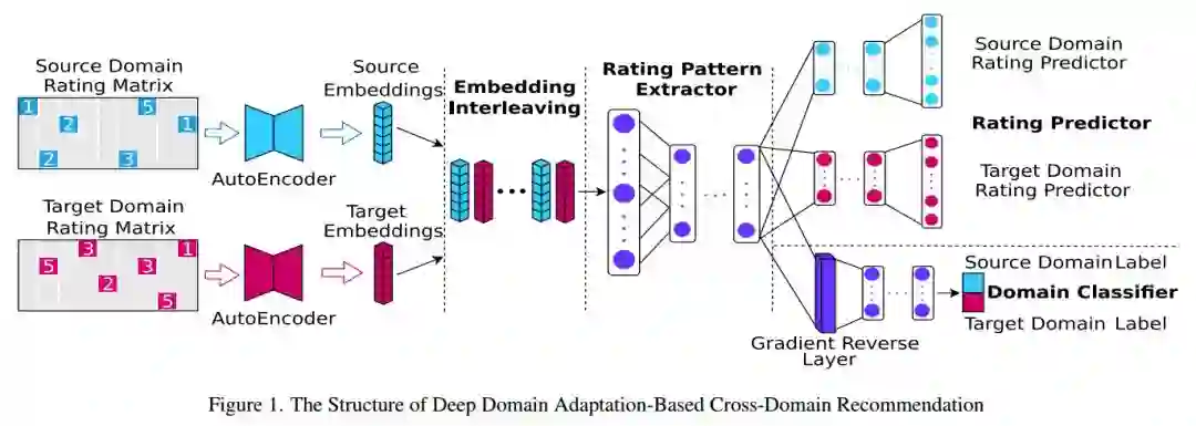 DARec: Deep Domain Adaptation for Cross-Domain Recommendation via Transferring Rating Patterns 跨域推荐长期以来一直是推荐系统中的主要研究课题之一,近年来,人们提出了各种深度模型来进行跨域的知识迁移,但大多侧重于从辅助内容(如图像和评论文本)中提取抽象的可迁移特征,而评分矩阵本身中的模式很少被触及。本文在域自适应概念的启发下,提出了一种深度域自适应模型(DARec),该模型能够在不依赖任何辅助信息的情况下,从评分矩阵中提取和传递模式。我们在公共数据集上实证地证明了我们的方法在几种最先进的可供选择的跨域推荐模型中取得了最佳的性能。 论文地址:https://www.ijcai.org/proceedings/2019/0587.pdf