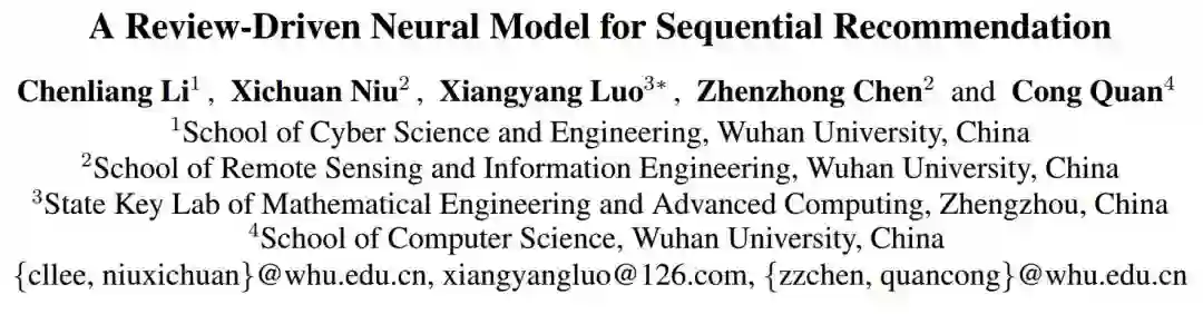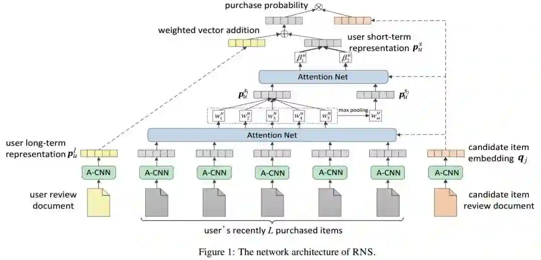 A Review-Driven Neural Model for Sequential Recommendation 对购买的项目的写评论是在电子商务中表达用户意见的独特渠道。近来,已经提出了许多基于深度学习的解决方案,通过利用用户评论来进行评分预测。相反,很少有人试图利用由用户评论所涵盖的语义信号来完成协同过滤的任务。本文通过考虑用户“内在偏好(长期)”和“序列模式”(短期),提出了一种新的基于评论驱动的神经序列推荐模型(简称RNS)。详细地说,RNS被设计成用从评论中提取的aspect-aware的表示来编码每个用户或项目。给出用户的历史购买商品序列,设计了一种新的层次关注机制,用于在联合级(union-leave了)和独立级(individual-level)捕获序列模式。在三个不同领域的真实世界数据集上进行的广泛实验表明,相对于最新的最先进的序列推荐模型,RNS获得了显著的性能改进。 论文地址:https://www.ijcai.org/proceedings/2019/0397.pdf