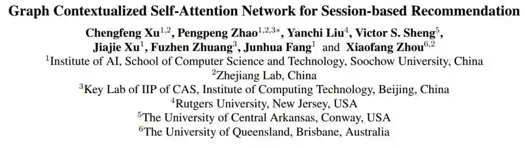 Graph Contextualized Self-Attention Network for Session-based Recommendation 基于session的推荐是许多在线服务(比如电子商务、媒体流)中的一项关键任务。近年来,自注意力网络(SAN)在不使用递归或卷积网络的情况下,在各种序列建模任务中取得了显著的成功。然而,SAN缺乏在相邻项上存在的局部依赖关系,并且限制了它学习序列中项的上下文表示的能力。本文提出了一种利用图神经网络和自注意力机制进行session推荐的图上下文自注意力模型(GC-SAN)。在GC-SAN中,我们动态地构造了session序列的图结构,并通过图神经网络(GNN)捕获了丰富的局部依赖关系。然后,每个session通过应用自注意力机制来学习长期依赖关系。最后,每一个session被表示为全局偏好和当前兴趣的线性组合。在两个真实世界的数据集上进行的广泛实验表明,GC-SAN的性能始终优于最先进的方法。 论文地址:https://www.ijcai.org/proceedings/2019/0547.pdf