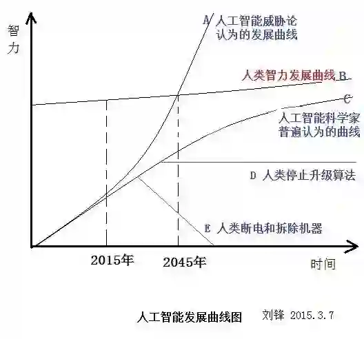 1、对人工智能的技术和原理不够清晰,做误解延伸,产生恐慌,例如人工智能智力水平在单调递增,但也许是指数曲线,也许是无限逼近某一水平线,人工智能威胁论者容易选择指数递增,于是得出结论认为在某个时间点将超越人类智慧,但人工智能科学家往往认同人工智能智慧无限逼近人类智慧,如下图所示: