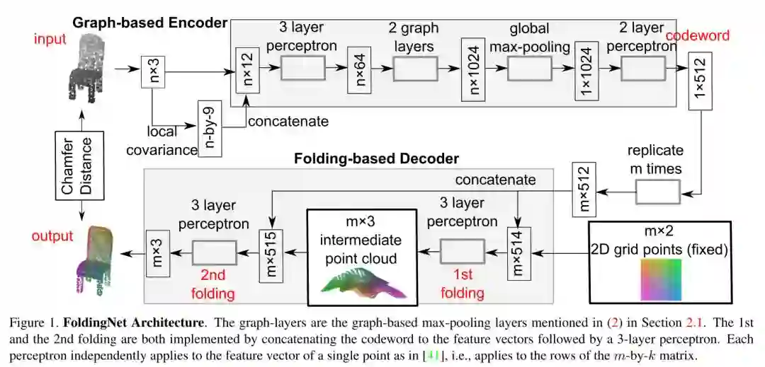 稍后将说明折叠操作可以在提供适当代码字的情况下构建任意表面。注意,当数据是体素格式而不是二维表面时,一个三维栅格可能表现更好。FoldingNet 网络结构如图1所示。