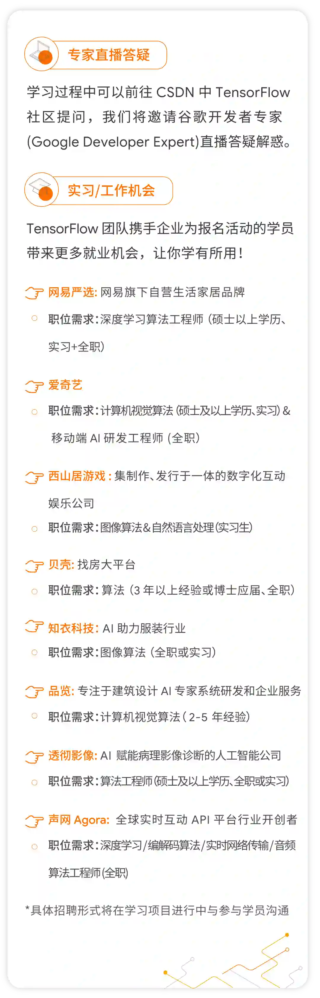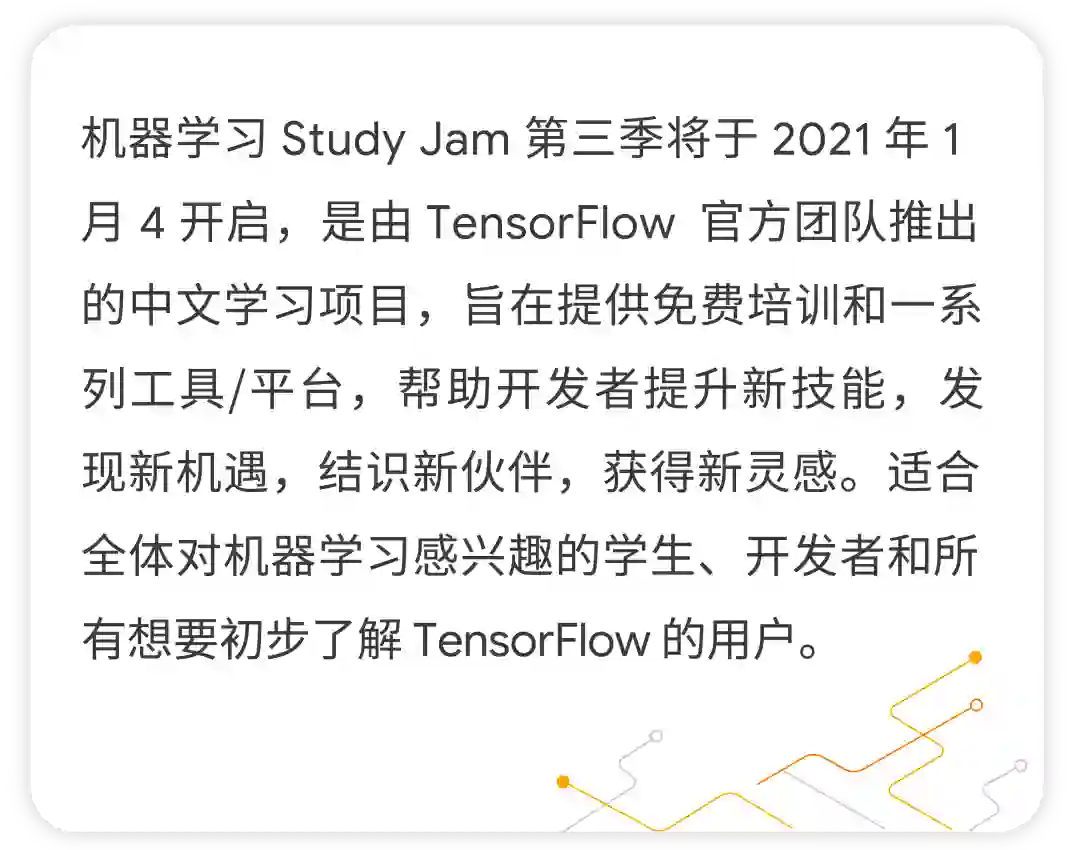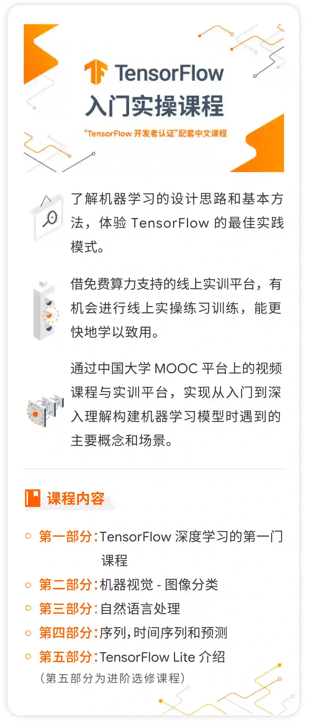 要初步了解 TensorFlow 的用户。这次学什么:了解机器学习的设计思路和基本方法,体验 TensorFlow 的最佳实践模式;借免费算力支持的线上实训平台,进行线上实操练习训练,更快地学以致用;通过中国大学 MOOC 平台上的视频课程与实训平台,实现从入门到深入理解构建机器学习模型时遇到的主要概念和场景。这次学什么:了解机器学习的设计思路和基本方法,体验 TensorFlow 的最佳实践模式;借免费算力支持的线上实训平台,进行线上实操练习训练,更快地学以致用;通过中国大学 MOOC 平台上的视频课程与实训平台,实现从入门到深入理解构建机器学习模型时遇到的主要概念和场景课程内容:第一部分:TensorFlow 深度学习的第一门课程第二部分:机器视觉 - 图像分类第三部分:自然语言处理第四部分:序列,时间序列和预测第五部分:TensorFlow Lite 介绍