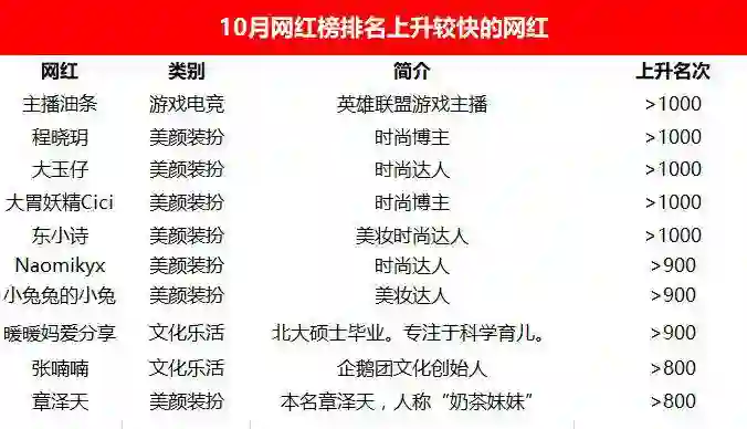 10月份上升较快的Top 10,主要为美颜装扮类红人以及2位文化乐活红人,1位游戏主播。上升最快的主播油条为英雄联盟游戏主播。