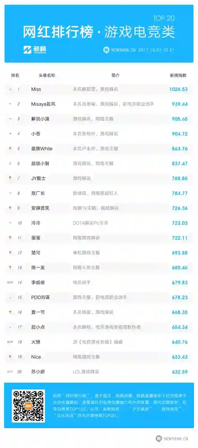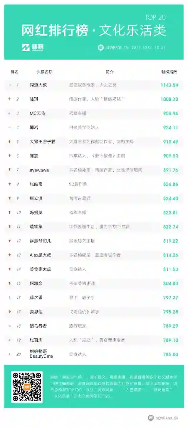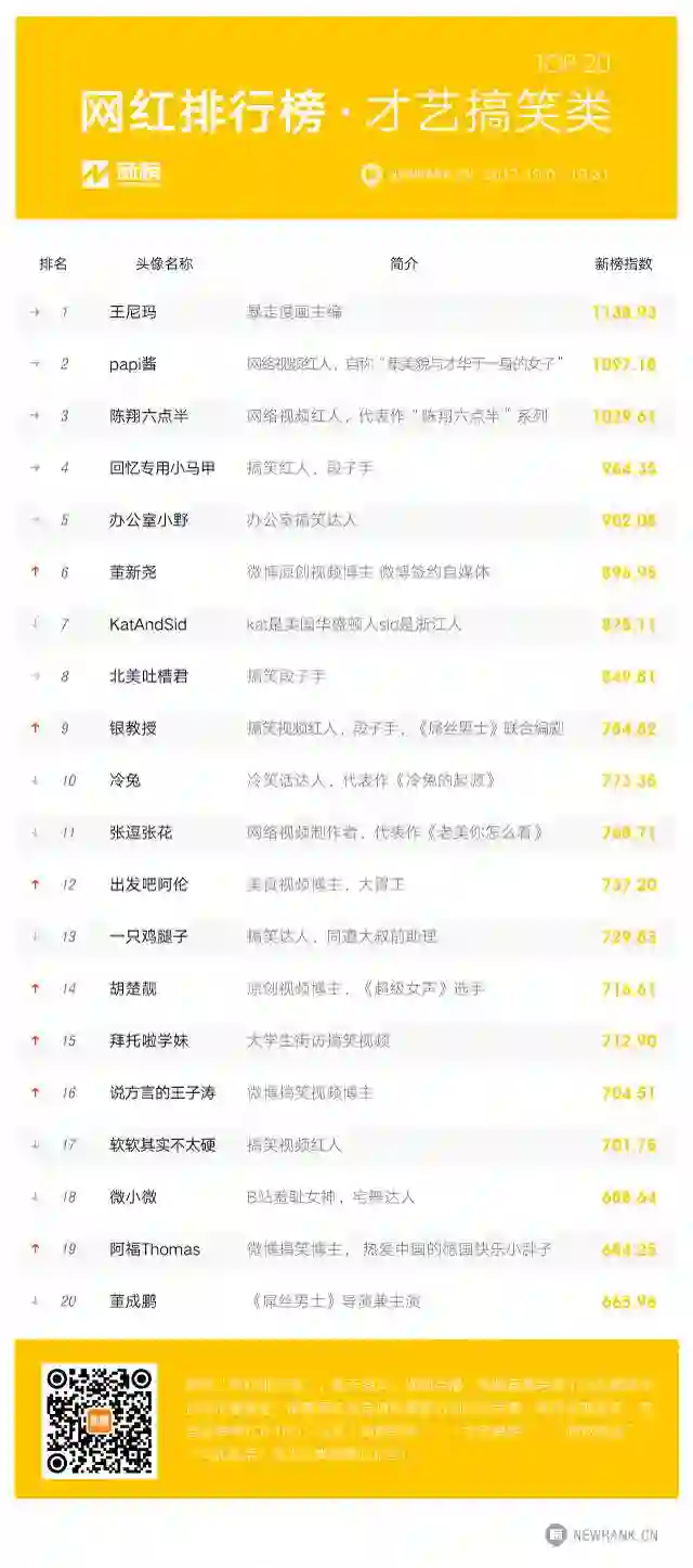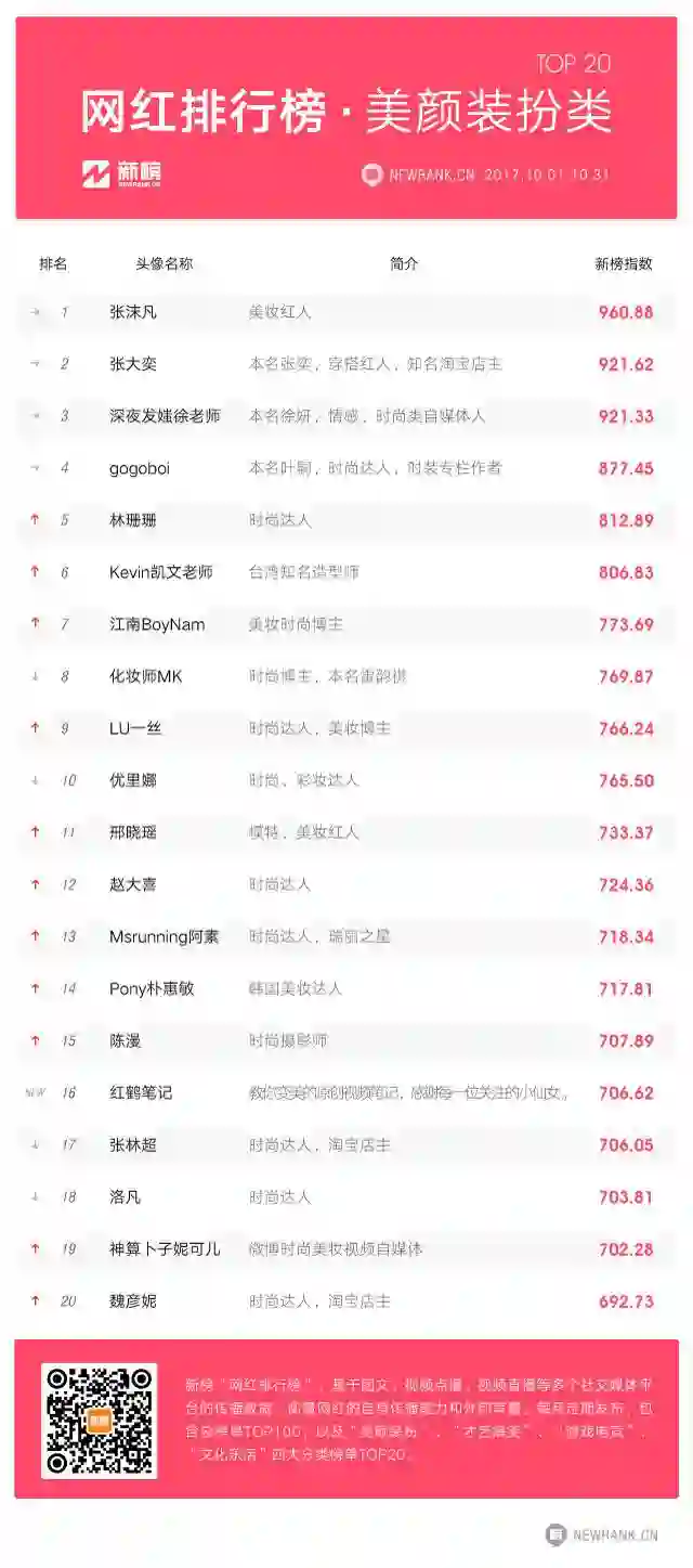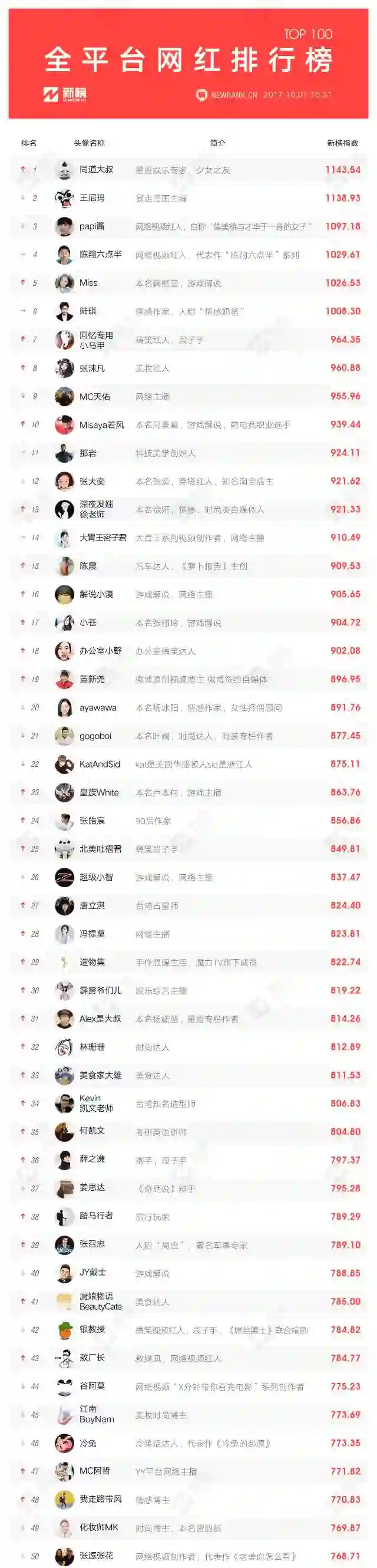 新榜今日发布2017年10月全平台网红排行榜,对于“网红”,我们的定义标准力求“纯粹”“典型”,必须具备以下特征: