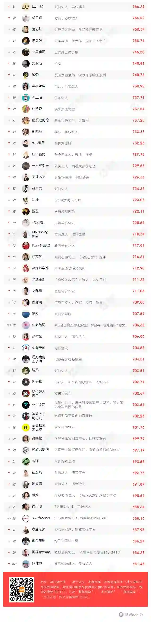 基于以上筛选标准,新榜对分散在新浪微博、微信公众号、综合类视频网站、短视频应用和直播平台5大类20多个网络平台的网红进行汇总,形成近9000个网红样本,并针对这些网红的自身传播能力和声量,进行数据采集和分析,最终生成2017年10月“网红排行榜”100强榜单,以及“美颜装扮”、“才艺搞笑”、“游戏电竞”、“文化乐活”四大分类榜单,具体算法附于文末。