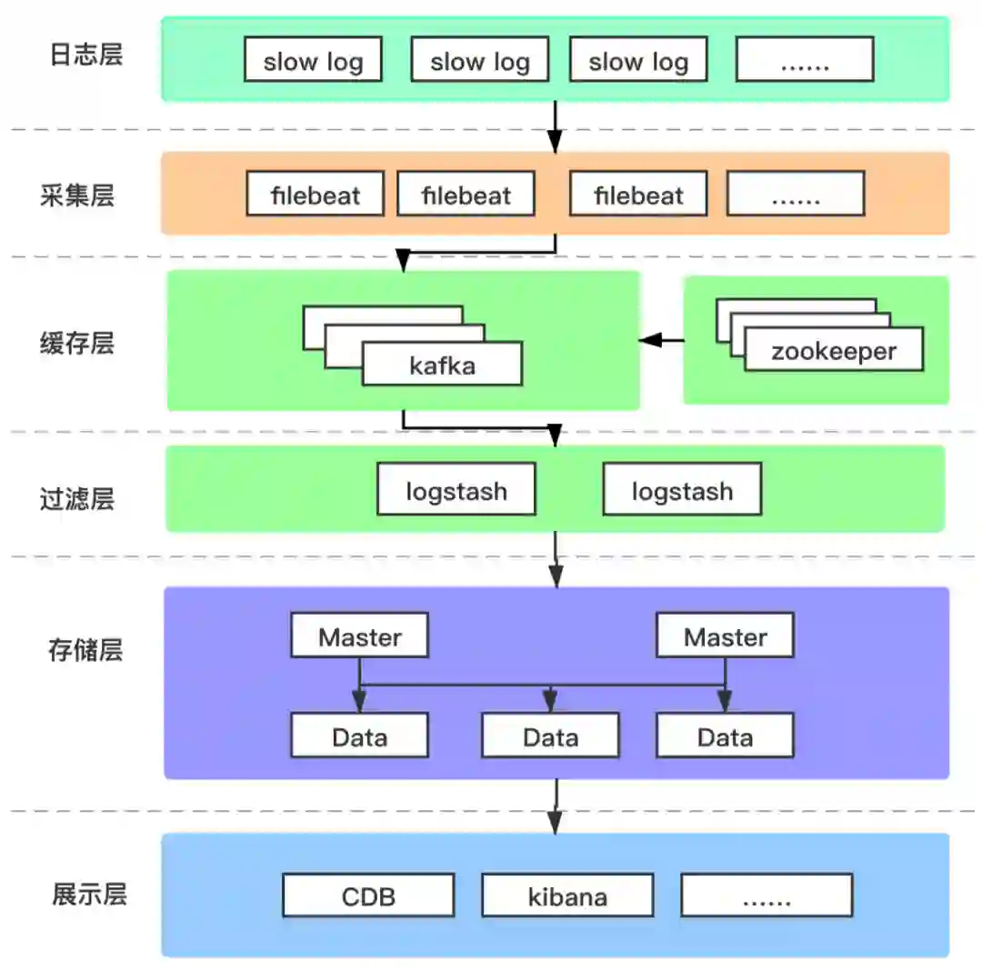 早期业内大家做MySQL的慢日志系统大都是获取上一整天的慢日志,进行统一分析,然后生成上一天的慢日志报表。这种方式有一定的滞后性,如果业务调整SQL或者新发布了一个功能想看实时的性能状况,这种需求是满足不了的。开发人员需要看到数据库实时的慢日志,以方便更快的进行性能诊断。我们使用ELKB技术栈来实现: