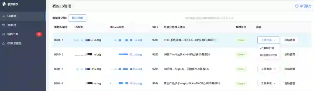 集群负责人可以从管理界面上看到自己名下的集群列表、Kibana地址、集群容量、操作申请等。