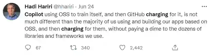 他表示,「Copilot用OSS(Open Source Software,开源软件)来训练,然后GitHub还要收费。这就跟我们大部分人用OSS开发app,还要收钱一样。那是不是也得给用的数据库和框架付钱啊?」