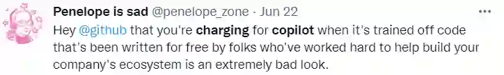 网友Penelope is sad同样表达了自己的不满,他表示,「GitHub你收Copilot钱?Copilot上都是我们这些人辛辛苦苦免费写的代码,我们帮你们搭建了不错的生态。你还要收钱?」