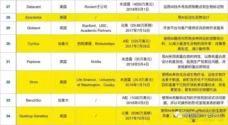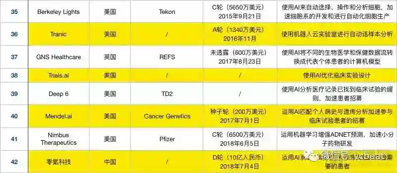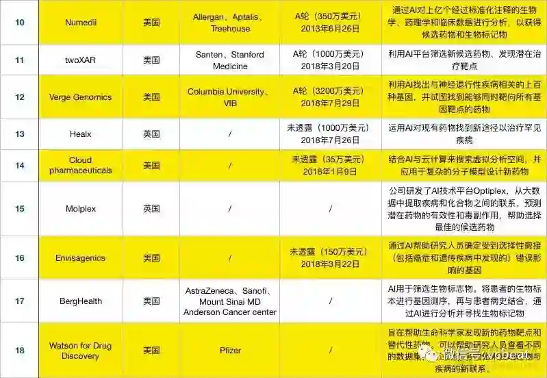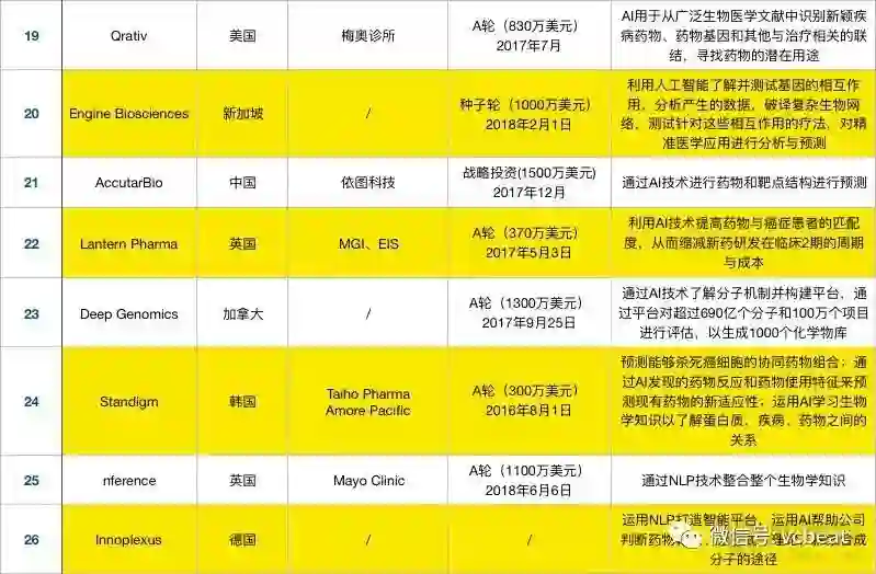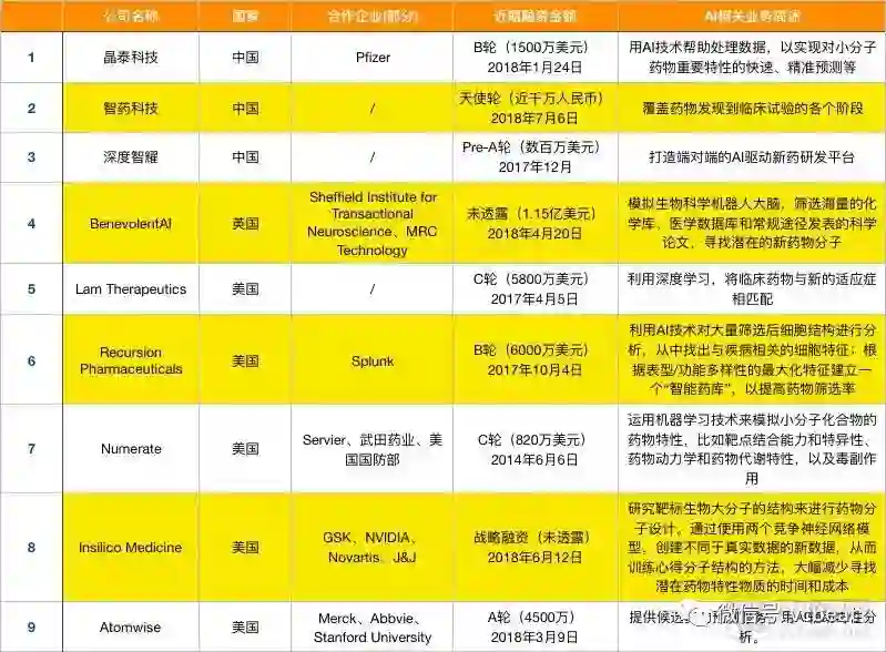 相比于2017年,国内在2018年新增了智药科技、深度智耀、AccutarBio、零氪科技四家企业利用AI技术深入药物研发,表格之外仍有不少药企正在开放针对性的深度学习算法。
