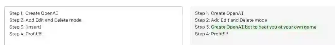 还有用户马上用这个新功能恶搞了OpenAI与GPT-3:「在代码的『增加编辑模式』与『搞钱』两步骤之间插入『OpenAI创建取代码农的bot』,就齐活了!」