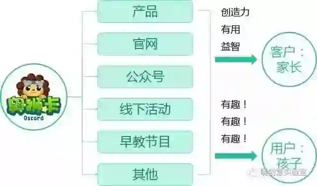 例如,奥狮卡的受众分为客户(家长)和用户(孩子),奥狮卡与受众的接触点有产品、官网、公众号、线下活动等;这些接触点向家长心智传递的是「创造力」、「有用」、「益智」,向孩子心智传递的是「有趣」。