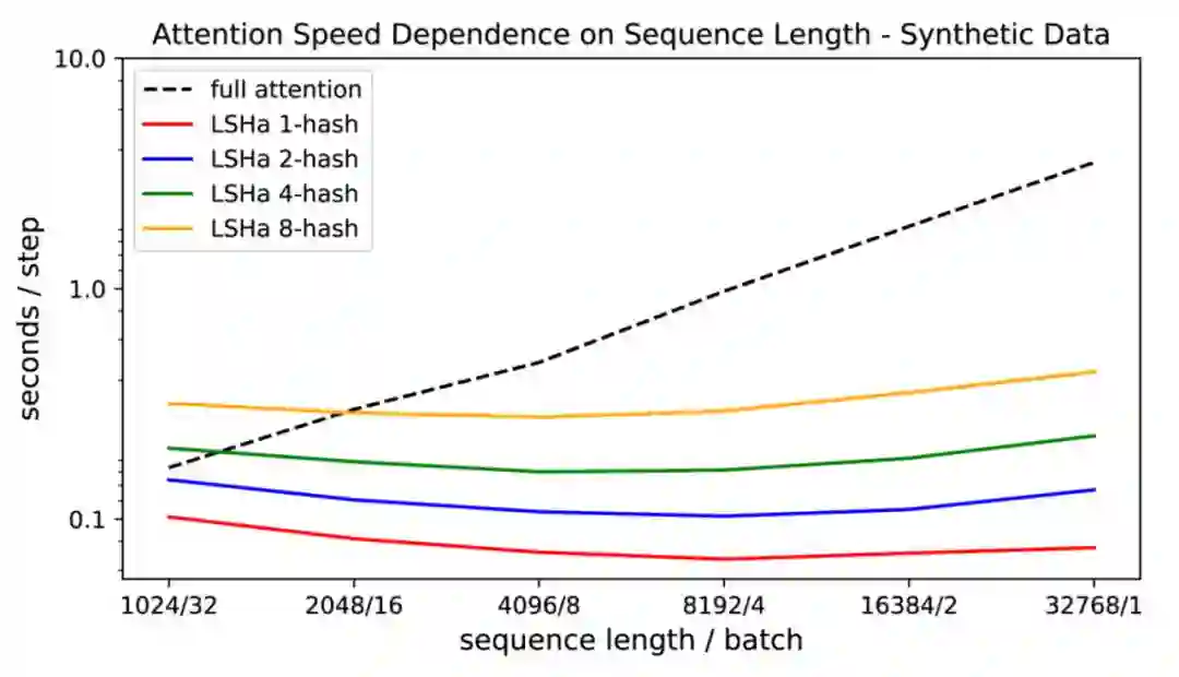 🎉他们也证明了传统注意力的速度随着序列长度的增加而变慢,而LSH注意力速度保持稳定,它运行在序列长度~ 100k在8GB的GPU上的正常速度: