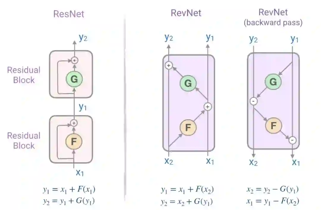 为了解决这个问题,由一系列可逆块组成的[可逆残差网络(RevNet)](https://papers.nips.cc/paper/6816reversib-resinetworkworkbackwithoutoutstorings -activations.pdf)。在Revnet中,每一层的激活都可以从后续层的激活中精确地重建,这使得我们可以在不将激活存储在内存的情况下执行反向传播。图6表示了残差块和可逆残差块。注意我们如何从它的输出(Y₁, Y₂)计算物体的输入(X₁, X₂)。